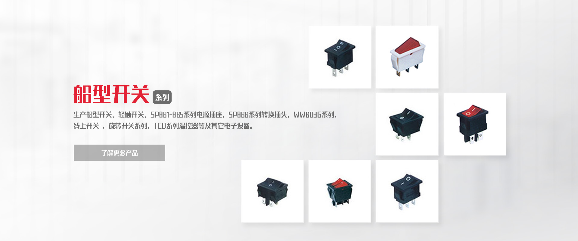 公司專(zhuān)業(yè)生產(chǎn)船型開(kāi)關(guān)、輕觸開(kāi)關(guān)、SP861-865系列電源插座、SP866系列轉(zhuǎn)換插頭、WW11系列微動(dòng)開(kāi)關(guān)、WW01-03、09系列按鈕開(kāi)關(guān)DS、WW系列指示燈開(kāi)關(guān)、WW603G系列 線(xiàn)上開(kāi)關(guān) 、旋轉(zhuǎn)開(kāi)關(guān)系列、TCD系列溫控器等及其它電子設(shè)備。